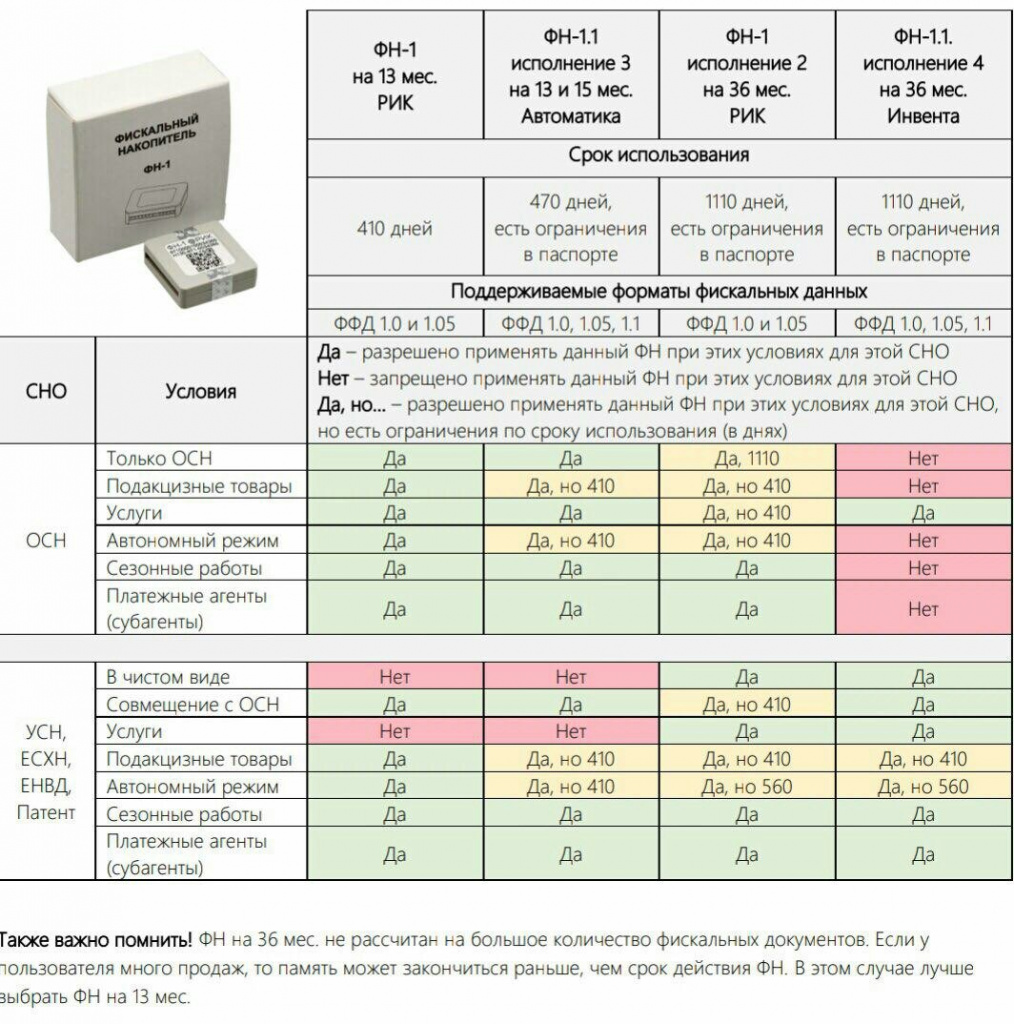 На сегодняшний день моделей фискальных накопителей более десятка штук, различного исполнения, различных сроков действия. Но законом и технической документацией определены особенности применения того или иного фискального накопителя, поэтому для правильного выбора фискального накопителя для ваше ККТ лучше обратиться к специалистам. За неправильный выбор ФН Вы можете быть привлечены к административной ответственности.