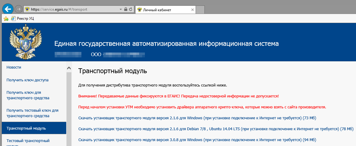 После входа в личный кабинет необходимо перейти в раздел "Транспортный модуль" и скачать актуальный дистрибутив.